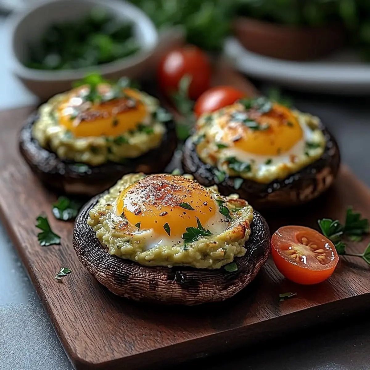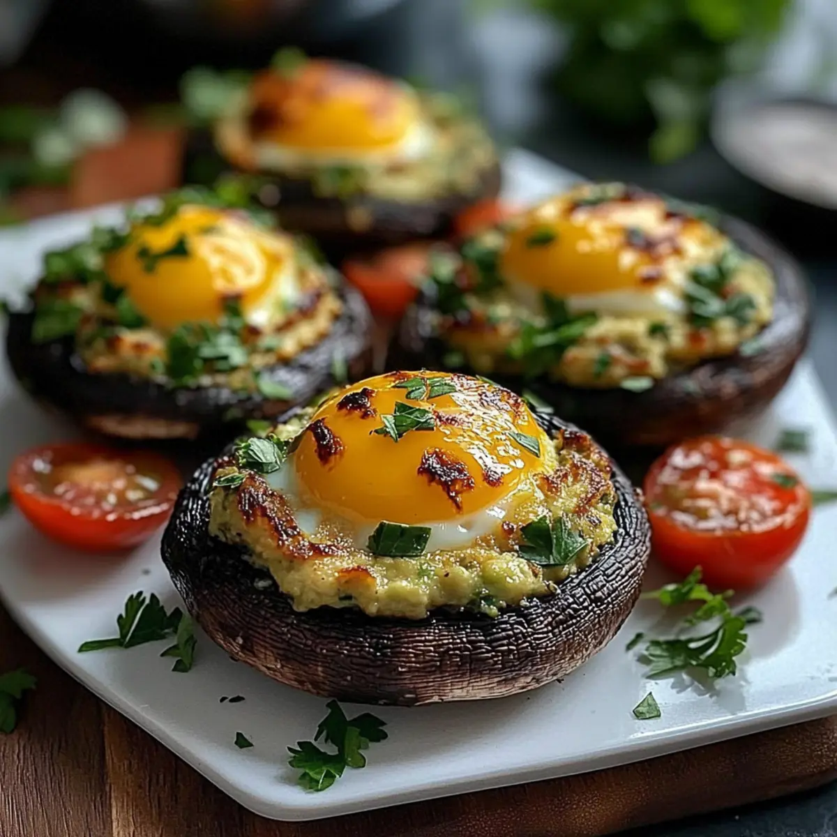 Place the stuffed mushrooms in the preheated oven and bake for 15-20 minutes. After the first 10 minutes, carefully add the seasoned cherry tomatoes around the mushrooms to roast alongside them. Keep an eye on the mushrooms; you want the egg whites to be set while the yolks remain slightly runny for that perfect creamy texture.