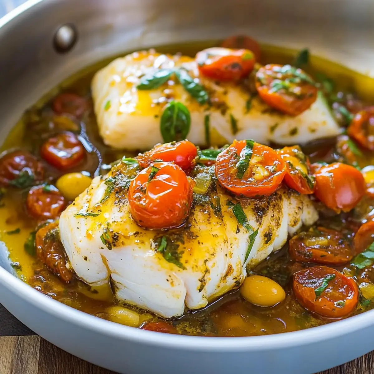 - Pour the white wine tomato basil sauce over the cod and warm through for about a minute before serving.