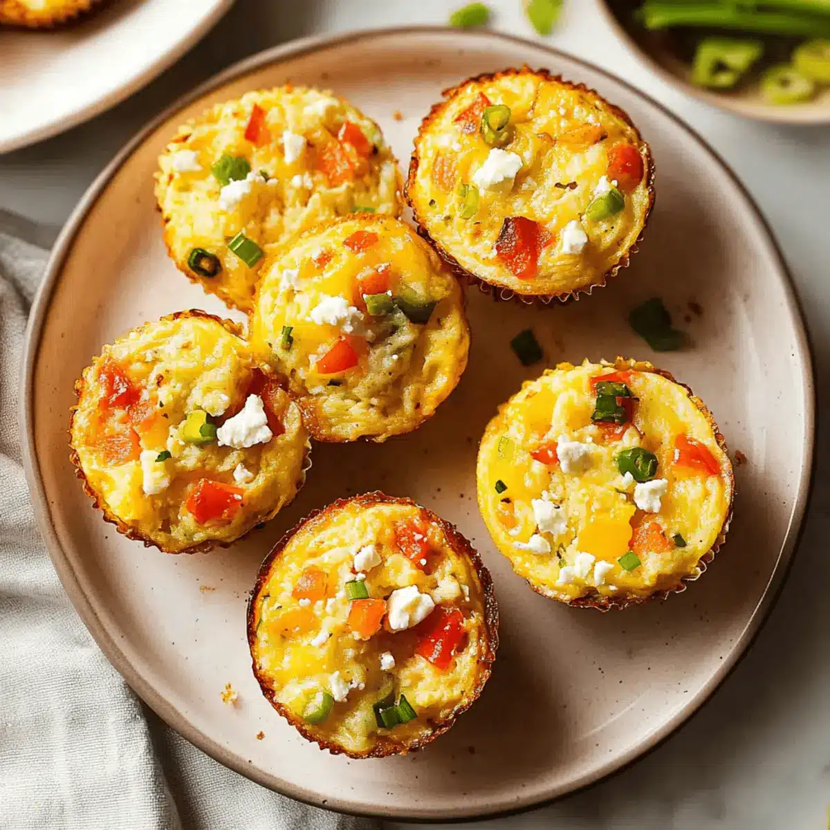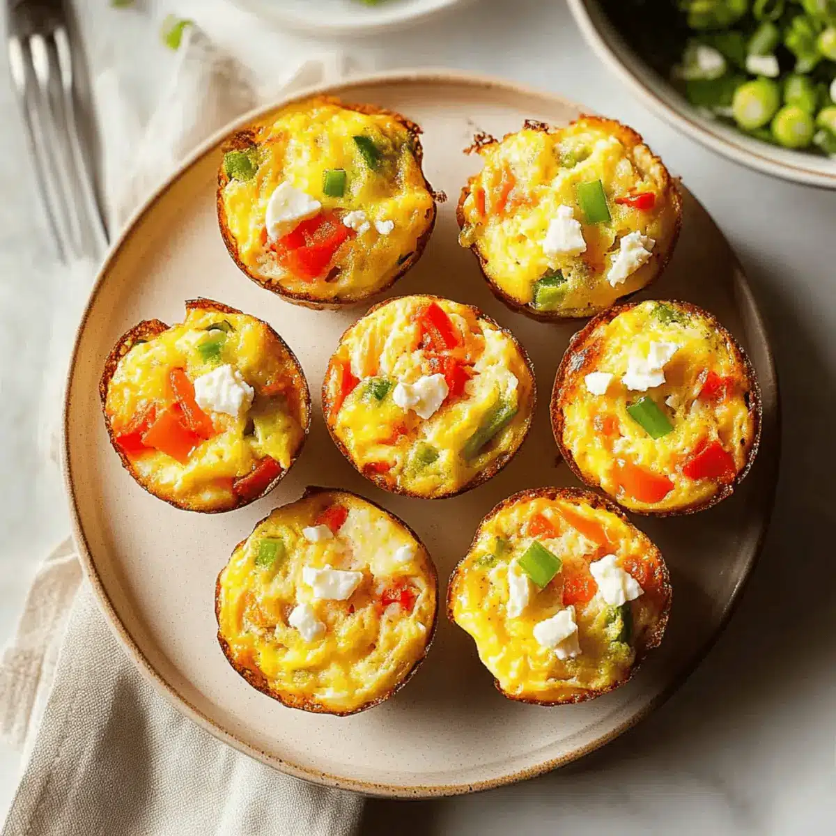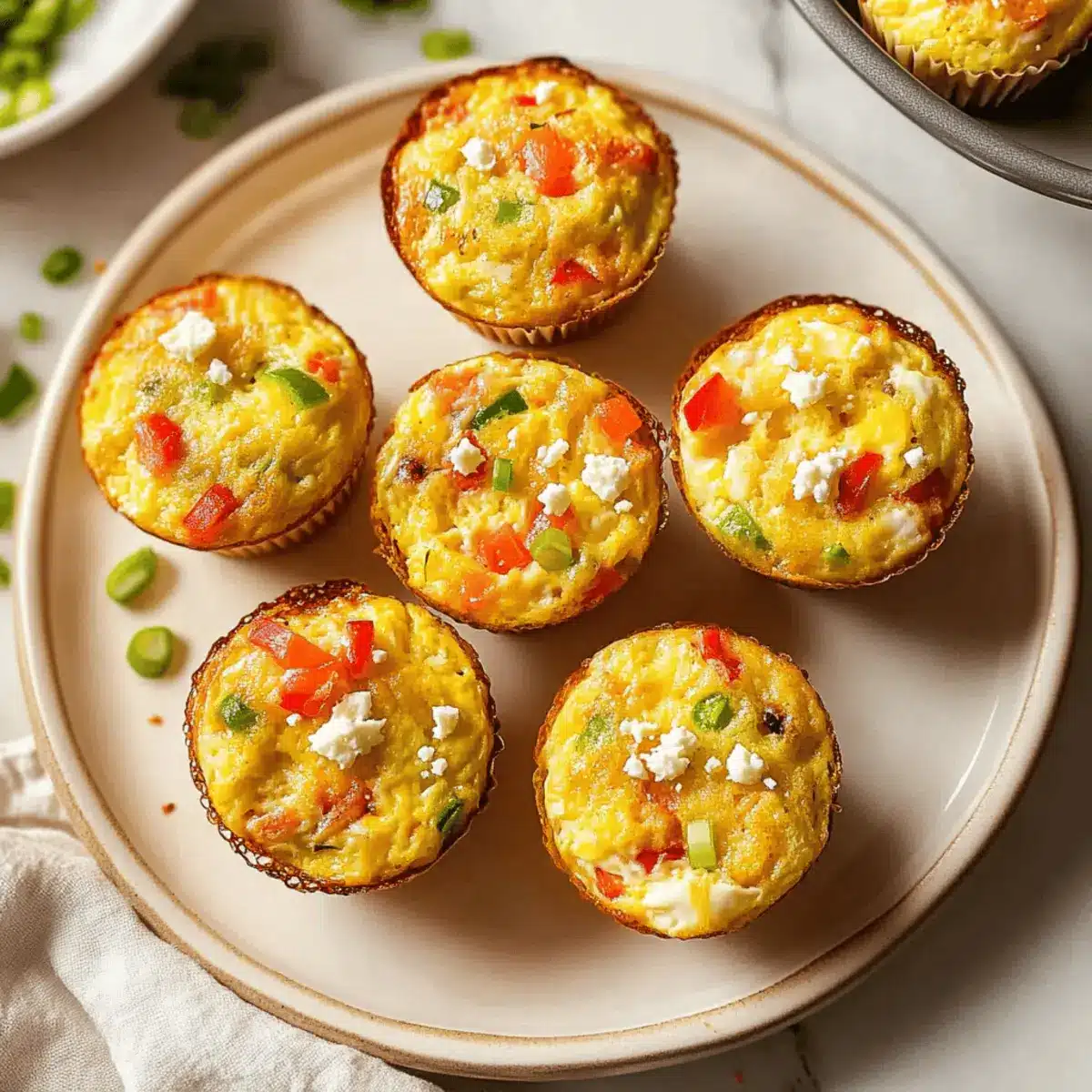 Sprinkle crumbled feta cheese generously over the top of the egg mixture in each muffin cup. The creamy texture of the feta will melt beautifully, adding a delicious tang and richness to your Fluffy Veggie and Egg Muffins.