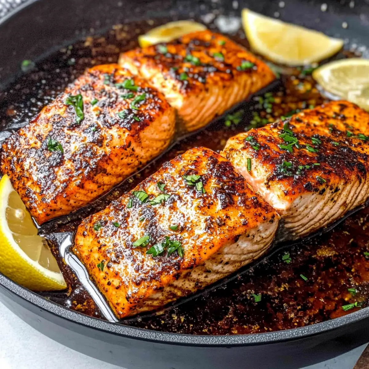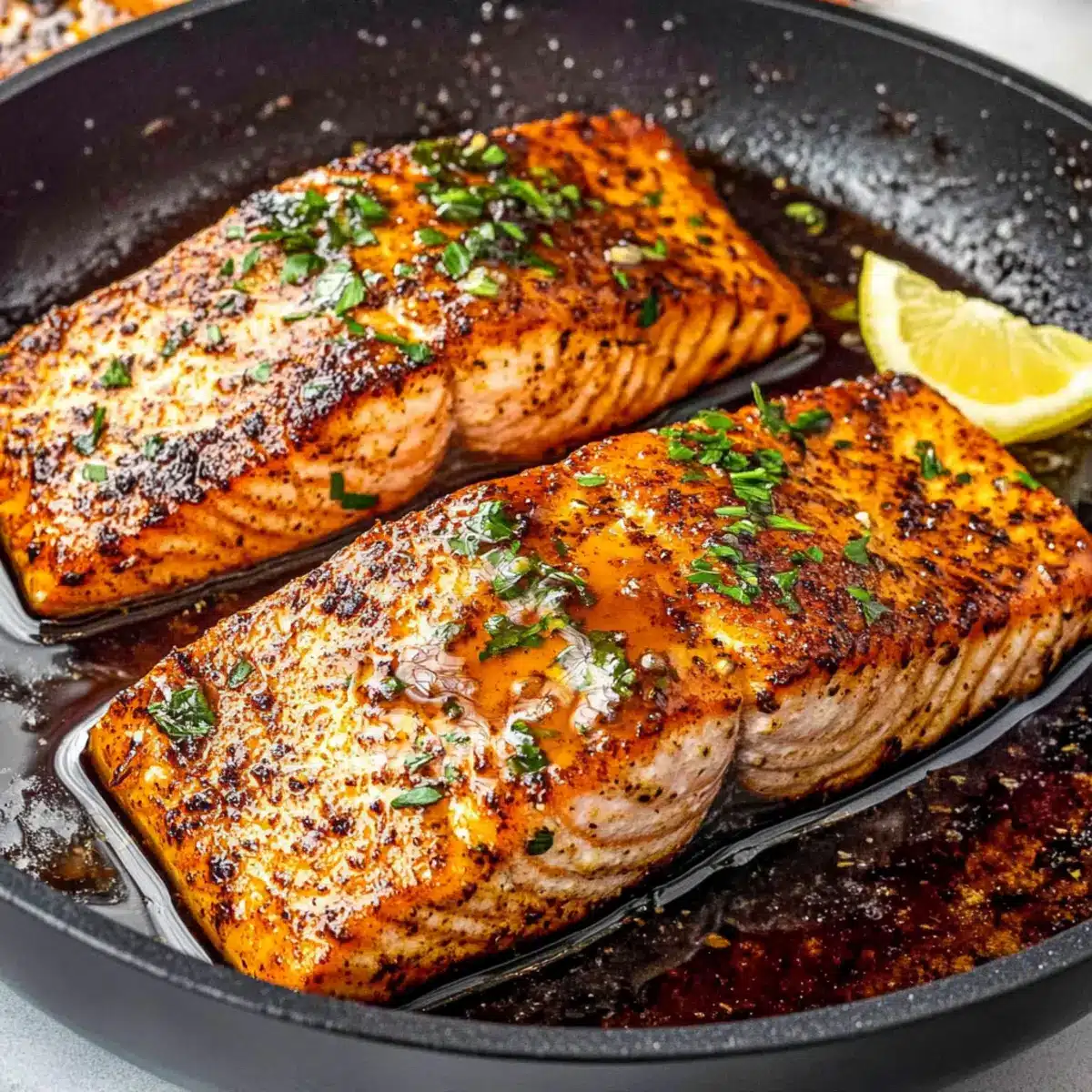 Once the salmon is perfectly cooked, transfer the fillets to a serving plate. Garnish with fresh parsley and a sprinkle of black sesame seeds for a lovely finish. Provide lemon wedges on the side for adding a burst of freshness. This Cajun Honey Butter Salmon is now ready to delight your taste buds!