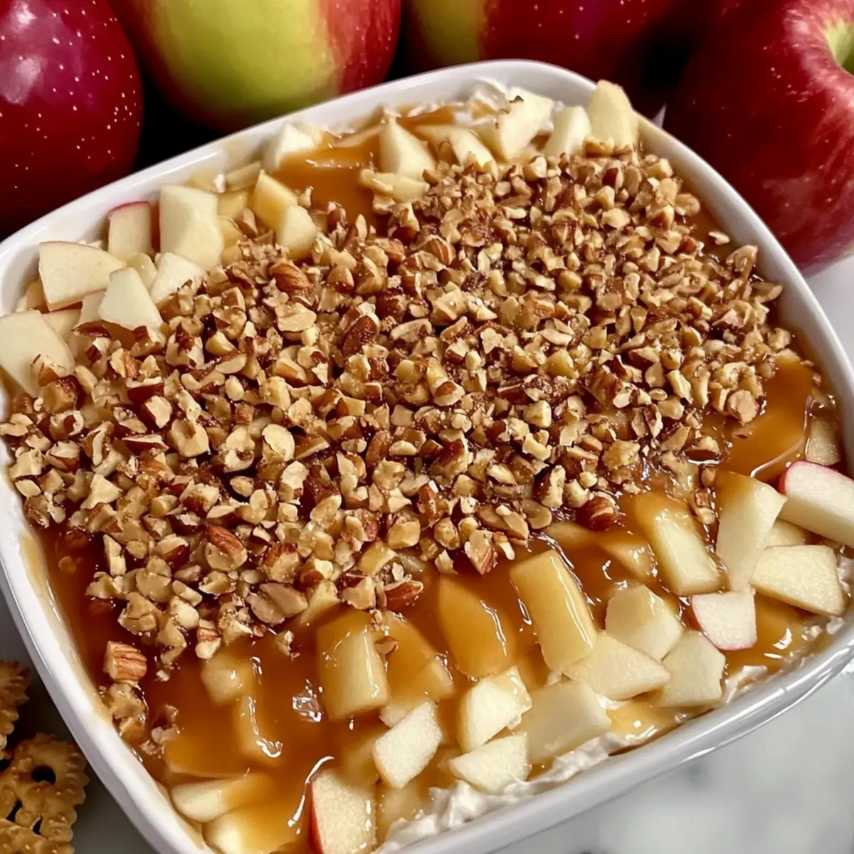 Sprinkle the diced or sliced medium apples on top of the caramel layer, followed by crushed pecans if using. The color and texture will create an inviting look, as well as add a delightful crunch to every bite of this tasty dip.