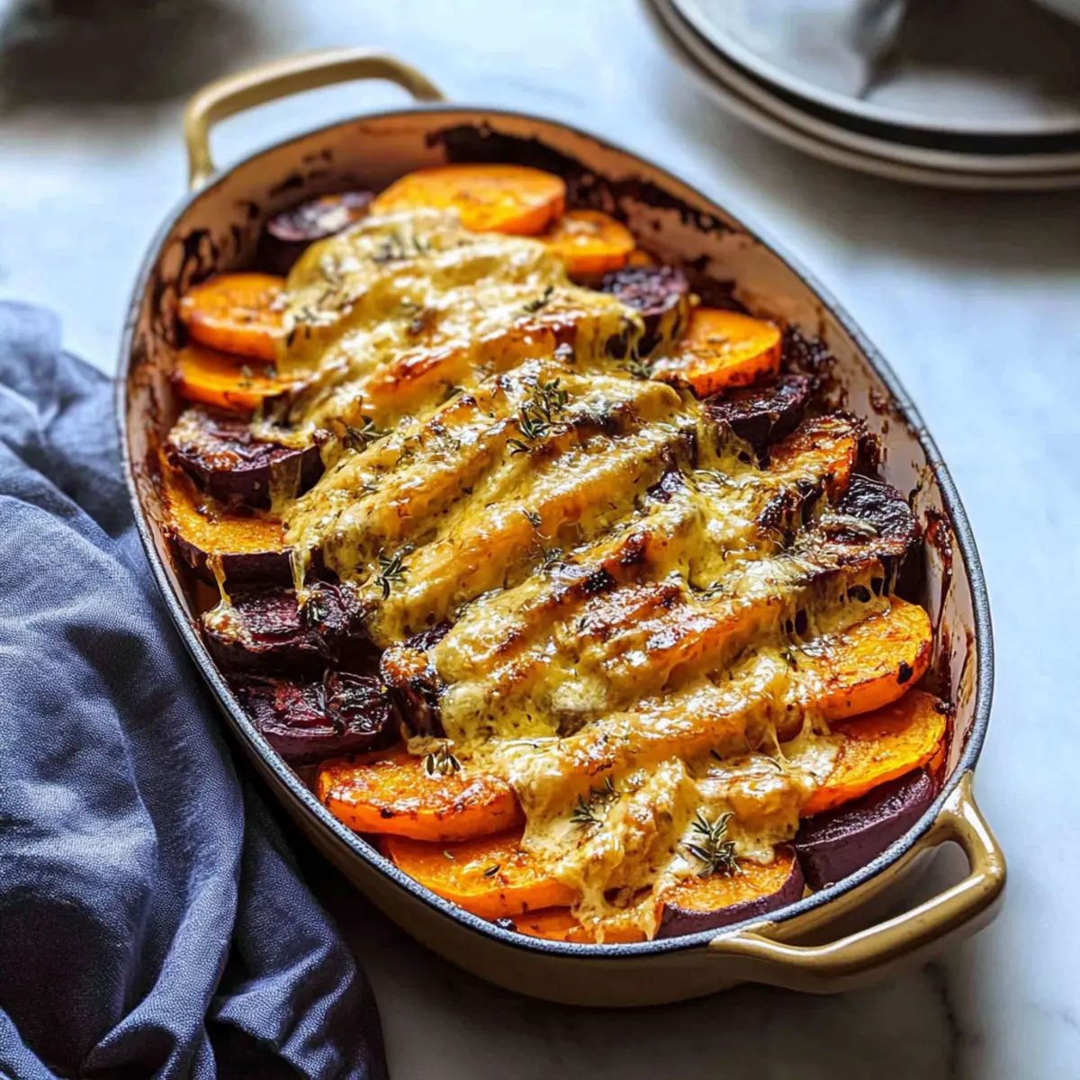 Absolutely! Sweet potatoes, parsnips, and beets are the stars of this Cheesy Root Vegetable Gratin. However, you can also experiment with other root vegetables like turnips or carrots for a unique twist on flavor and texture. Just aim for vegetables that can hold their shape when baked.