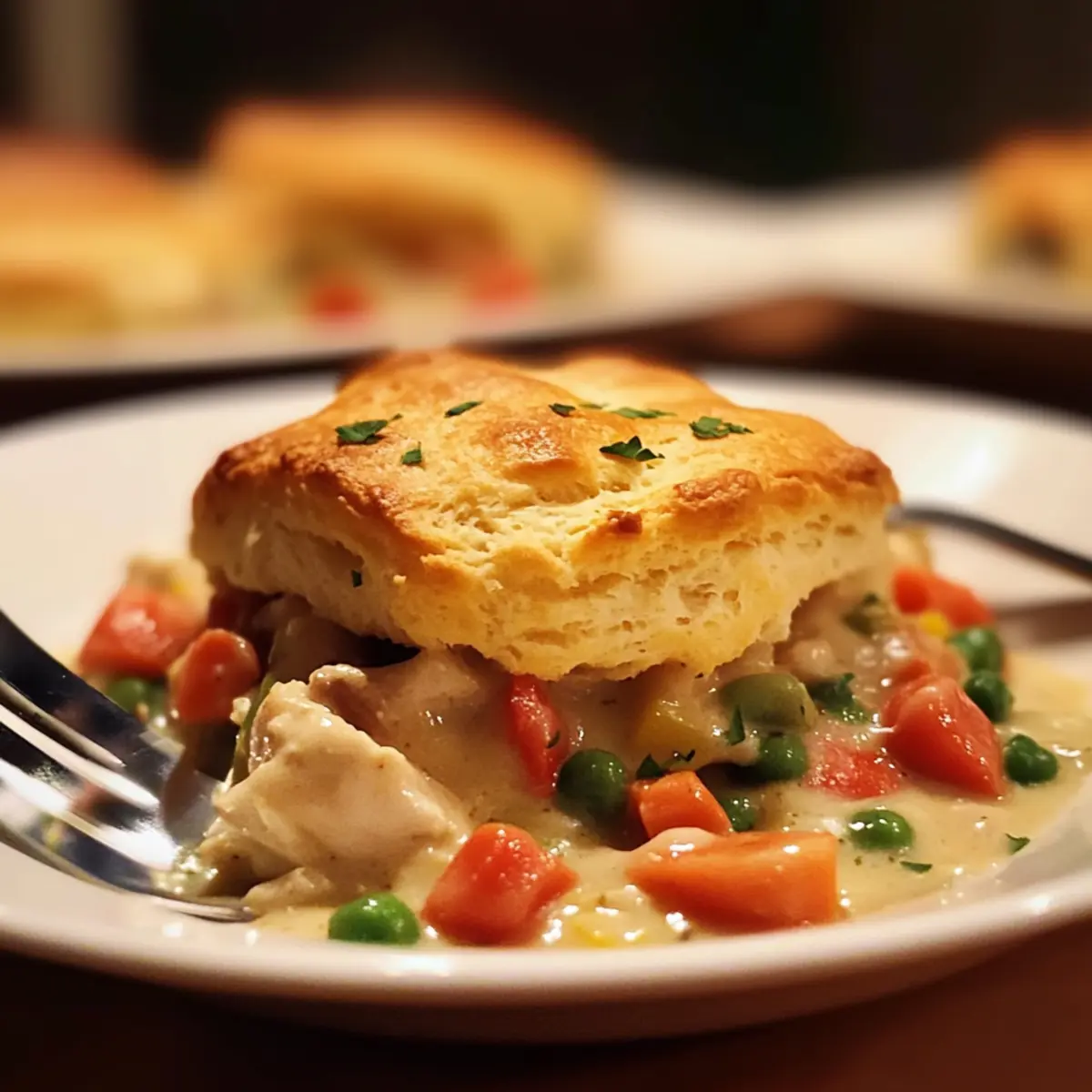 Once out of the oven, let the Chicken Pot Pie cool for a few minutes before serving. This resting period allows the filling to set slightly, making for easier slicing and serving. You’ll notice the biscuits remain fluffy and the filling perfectly creamy, creating a delightful dining experience.