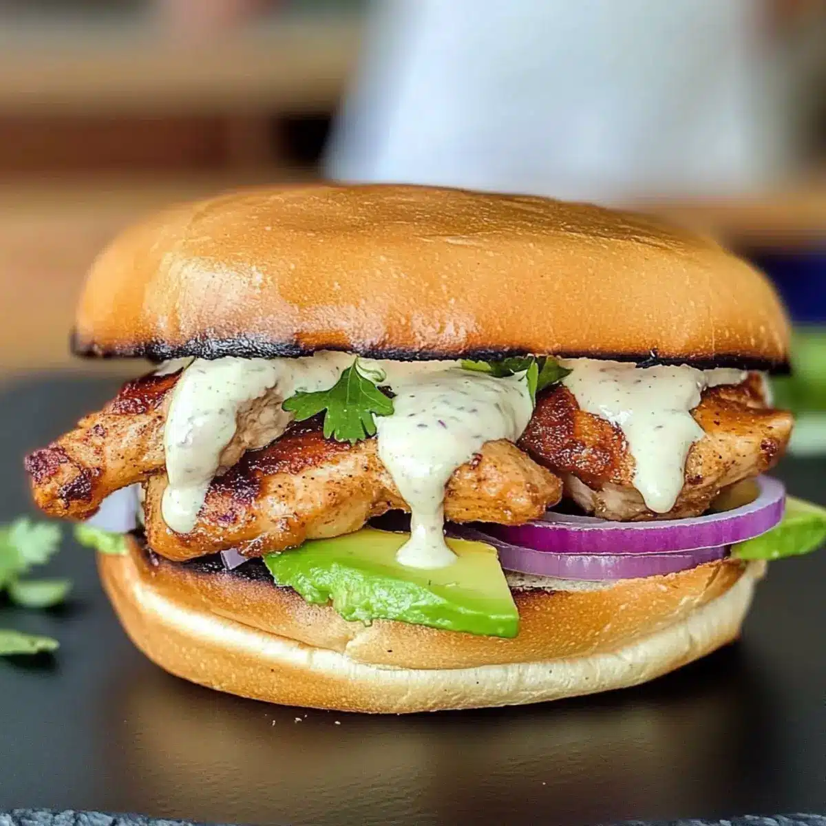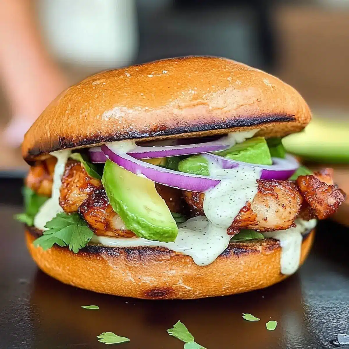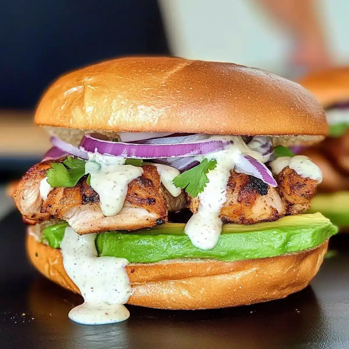 - Assemble sandwiches by spreading creamy jalapeno dressing on the bun, adding avocado slices, cheesy chicken, and red onion before topping with the other half.