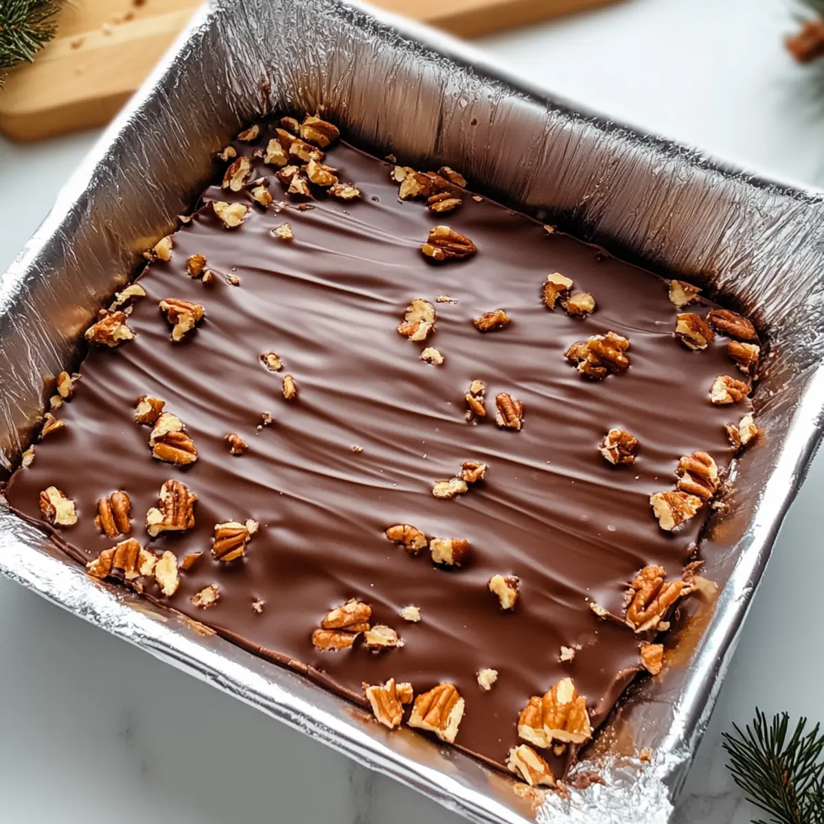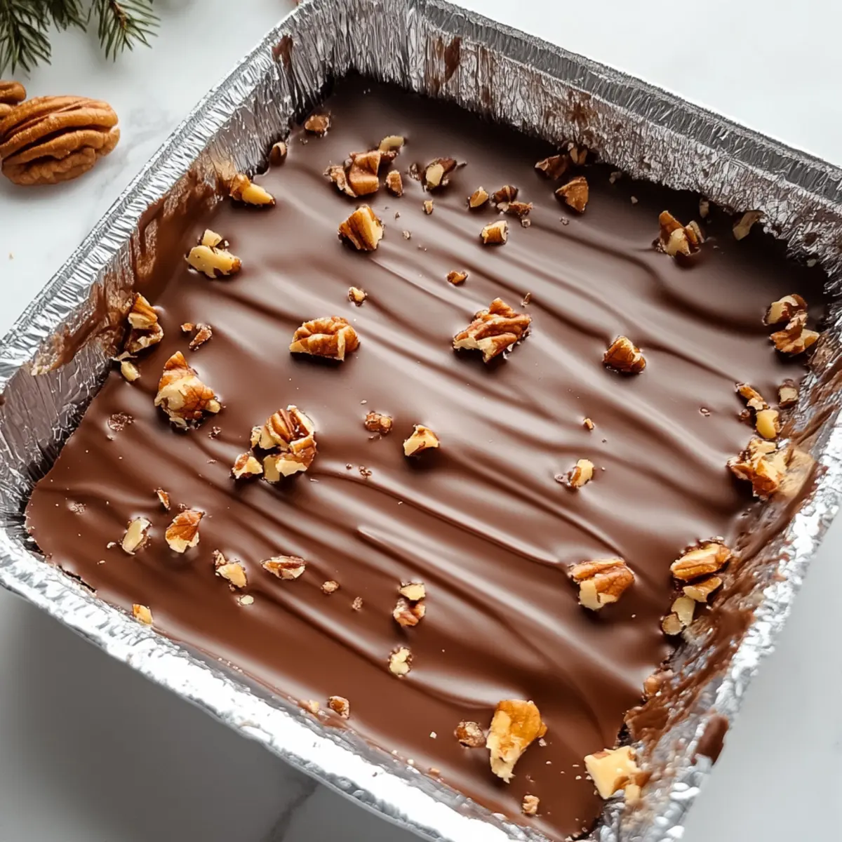 Spread 1 cup of chopped pecans evenly across the bottom of the prepared dish. Use your fingers or the back of a spoon to press them down gently; this will create a crunchy base that complements the smooth toffee layer above.