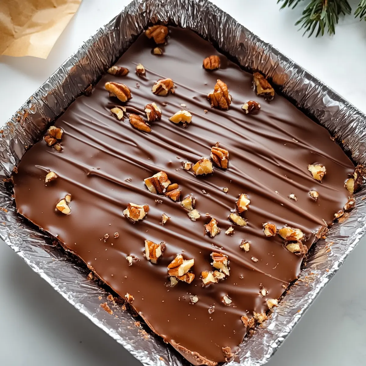 Using a spatula or the back of a spoon, swirl the melted chocolate to create a marbled effect. If desired, sprinkle finely chopped pecans and a touch of flaked sea salt on top for additional flavor and texture.