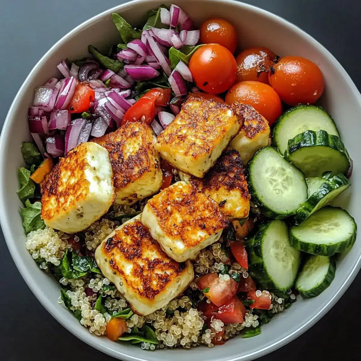 Now it’s time to bring your Crispy Halloumi Greek Power Bowl together! Start by layering a generous serving of the fluffy quinoa at the bottom of each bowl. Spoon the mixed vegetable salad over the quinoa, allowing the colors to shine. Finally, top each bowl with the crispy halloumi slices, arranging them artfully for a beautiful presentation that’s sure to impress!