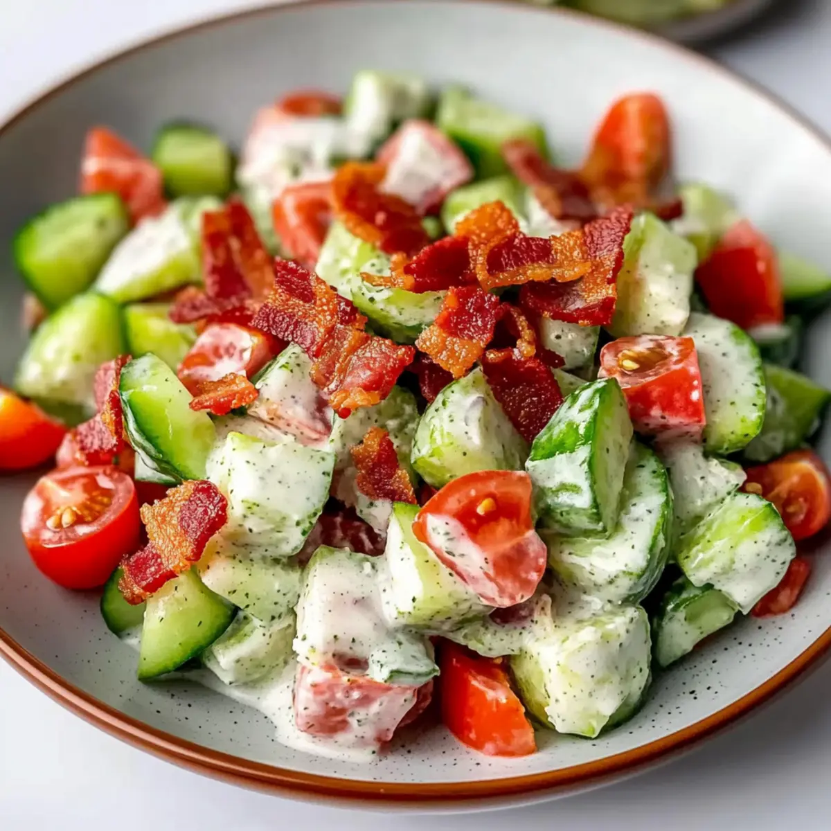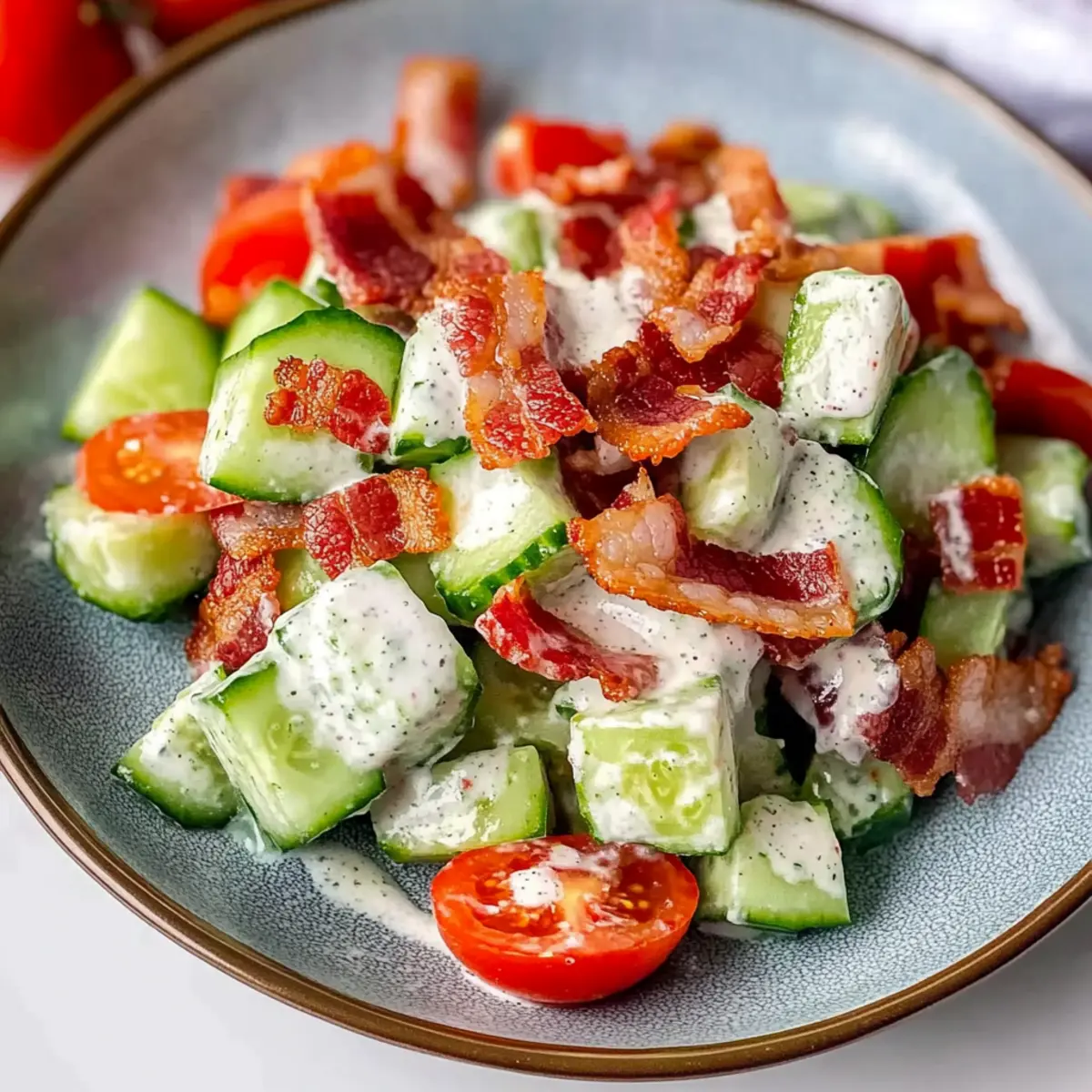 - Prepping Ingredients: To make ahead, keep the cucumbers, tomatoes, dressing, and bacon separate in airtight containers; mix them just before serving for optimal freshness.