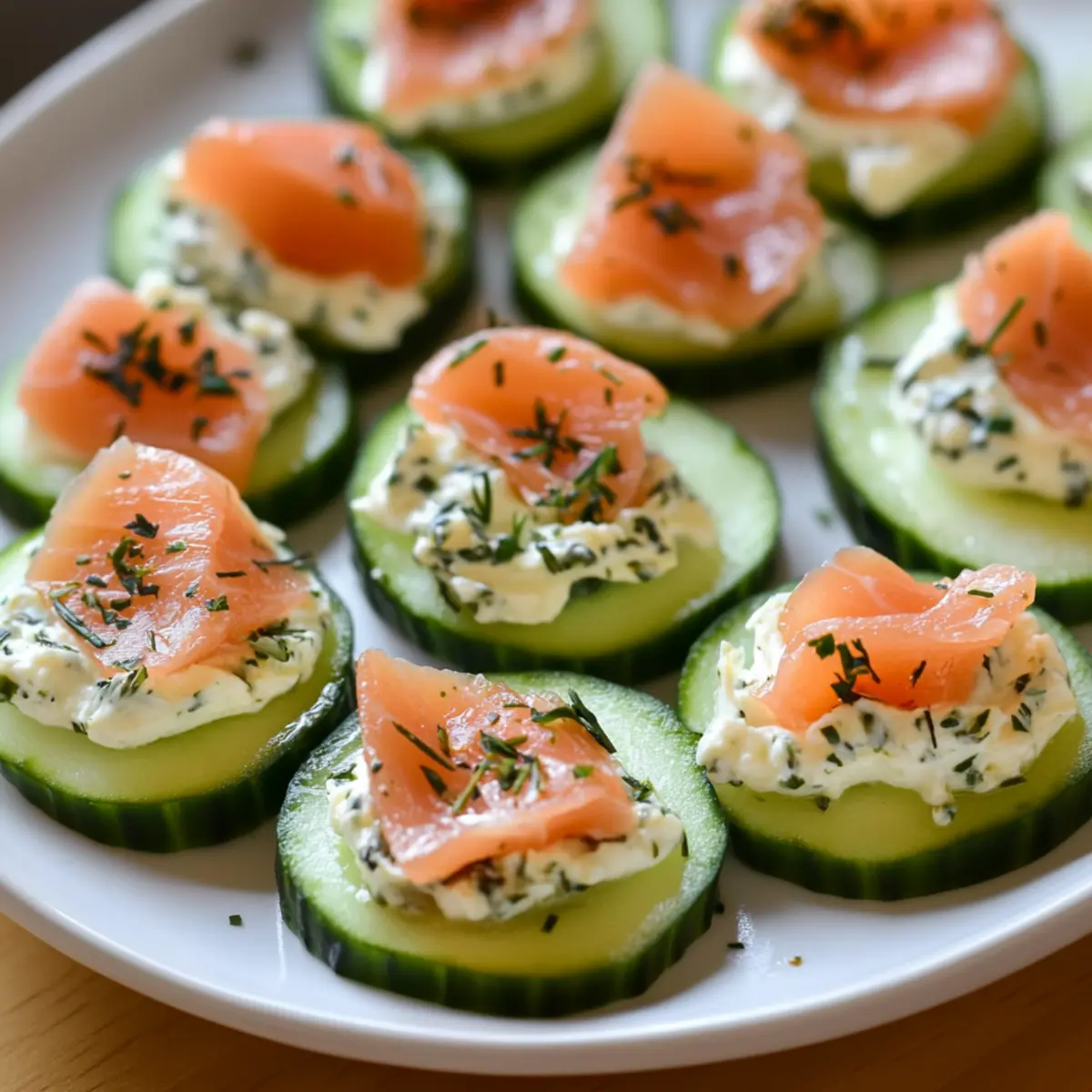 - Place a small piece of smoked salmon on each cucumber slice and gently press down to adhere.