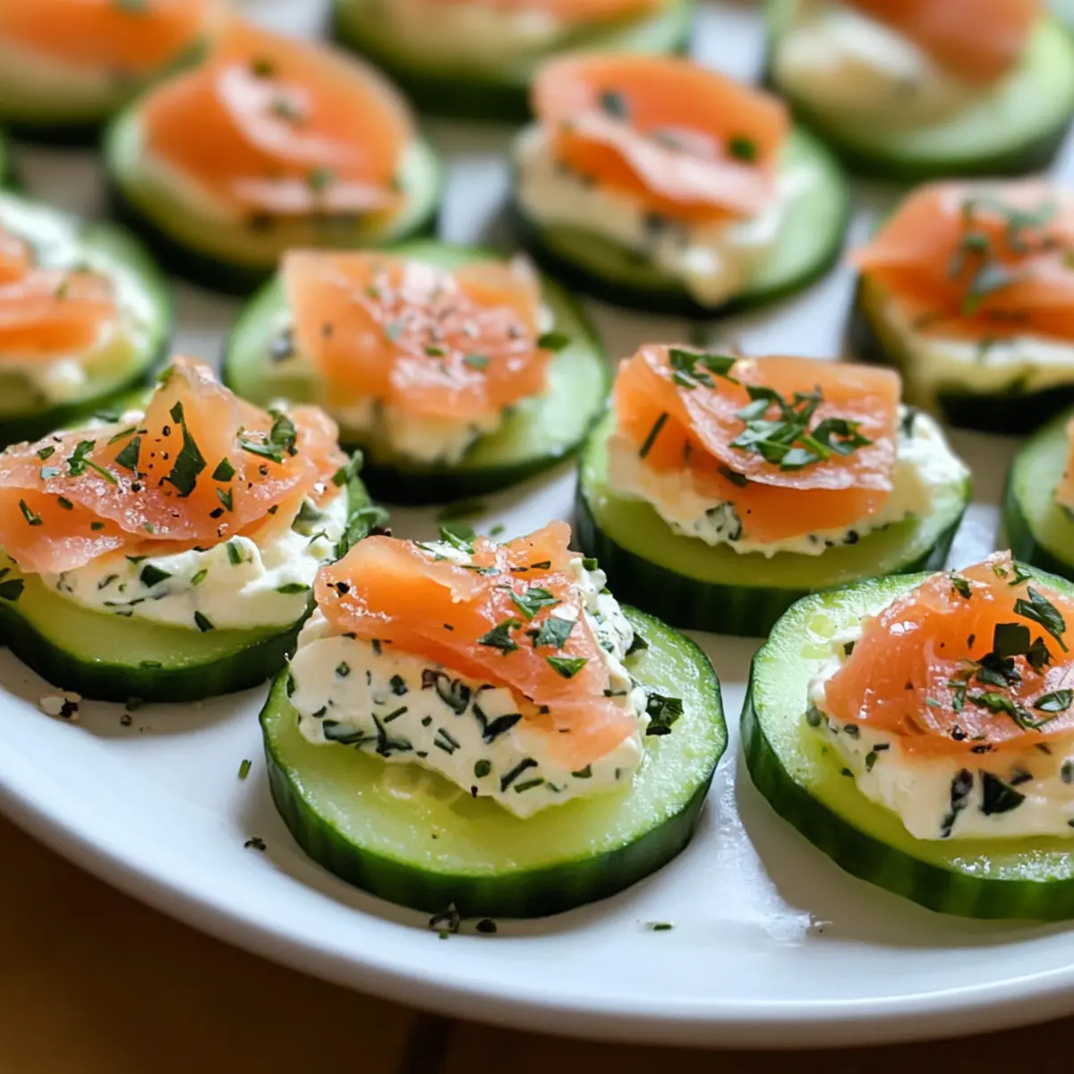 Effortless Preparation: With zero cooking involved, these bites come together in just 20 minutes—perfect for last-minute gatherings! Flavor Explosion: The combination of crisp cucumber, creamy herb cheese, and rich smoked salmon creates an irresistible medley that will wow your guests. Versatile Enjoyment: Serve them as a starter, alongside cocktails, or as part of a larger spread. They complement a variety of dishes, including delicious options like Spicy Salmon Bowls or Cranberry Brie Bites. Healthy Indulgence: At about 115 calories per serving, these bites keep the guilt at bay yet satisfy your appetizer cravings. Impressive Presentation: They not only taste great but also look elegant on any platter—making you the star of the show!