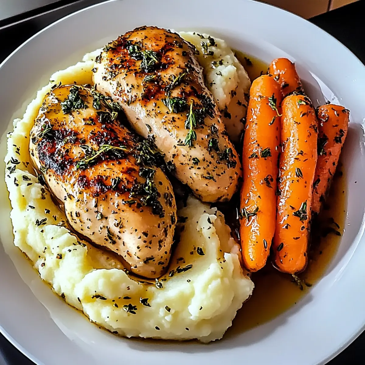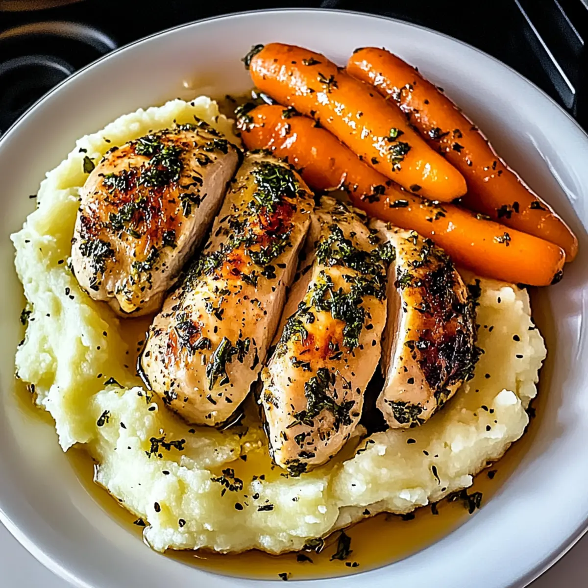 On each plate, begin with a generous scoop of creamy mashed potatoes, followed by sliced chicken breast atop. Arrange the sweet glazed carrots beside the chicken, and if desired, drizzle the sauce over the dish for added flavor. Garnish with fresh herbs for a pop of color and an aromatic finish. Enjoy the comforting essence of Garlic Herb Chicken with every bite!