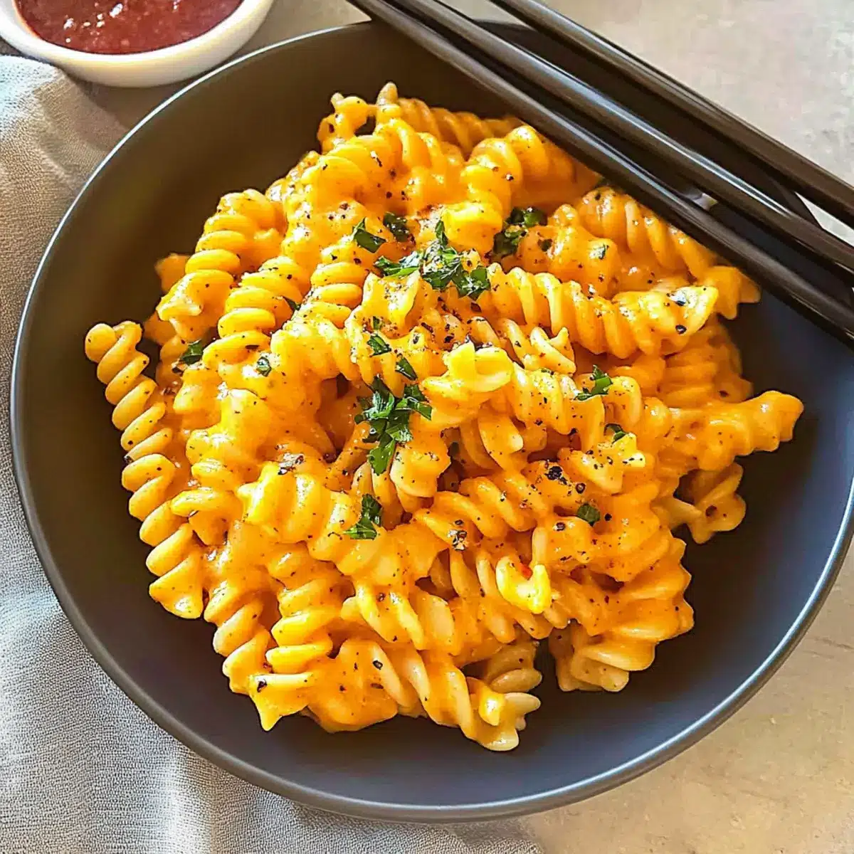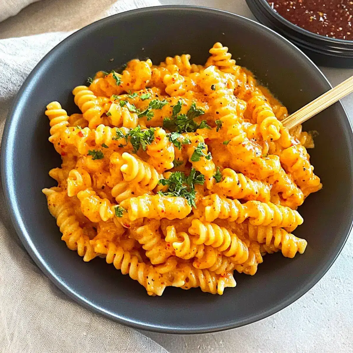 Once everything is well combined and heated through, transfer the creamy Gochujang Pasta onto serving plates. Sprinkle with freshly chopped parsley for a vibrant touch, and perhaps an extra pinch of black pepper for an aromatic finish. Serve immediately for the best experience, as the flavors meld harmoniously with every bite.