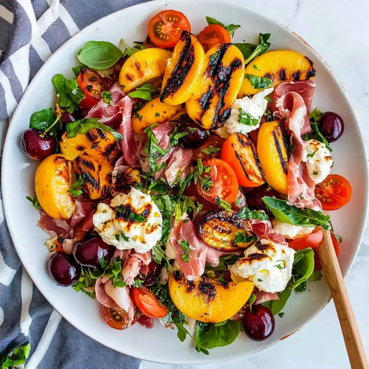 Gently fold in the grilled nectarines into your salad mixture, being careful not to damage the delicate fruit. The warmth from the nectarines will slightly wilt the greens, creating a beautiful medley of textures. This combination of sweet and savory will create a flavor explosion in your Grilled Nectarine Burrata Salad.