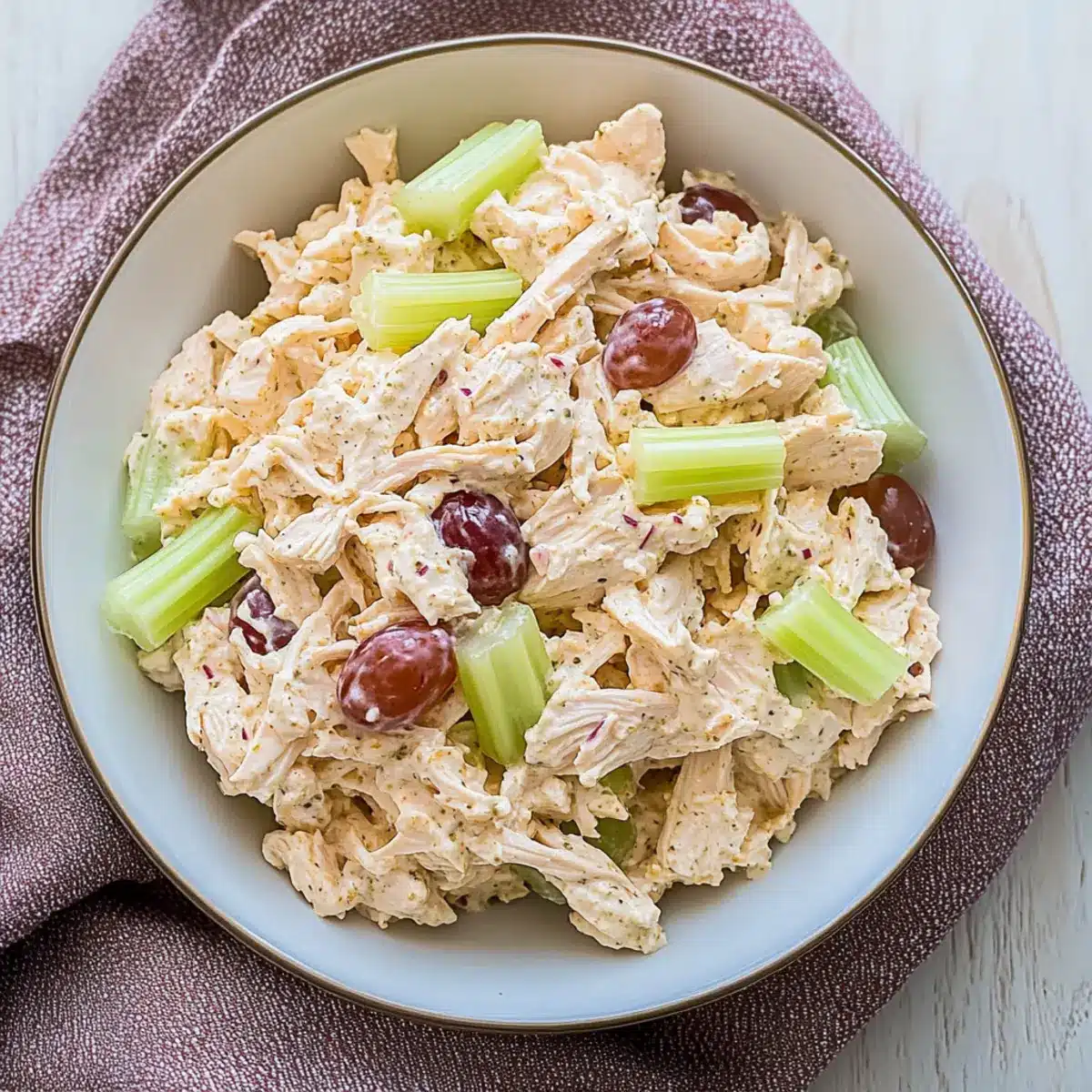 Fruit Swap: Replace grapes with dried cranberries or even chopped mango for a sweet twist that complements the savory chicken beautifully. Experimenting with fruits can bring an exciting new dimension to your salad.