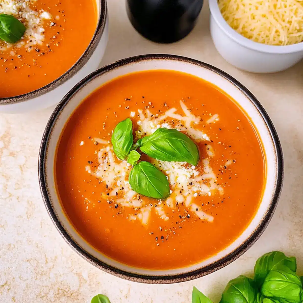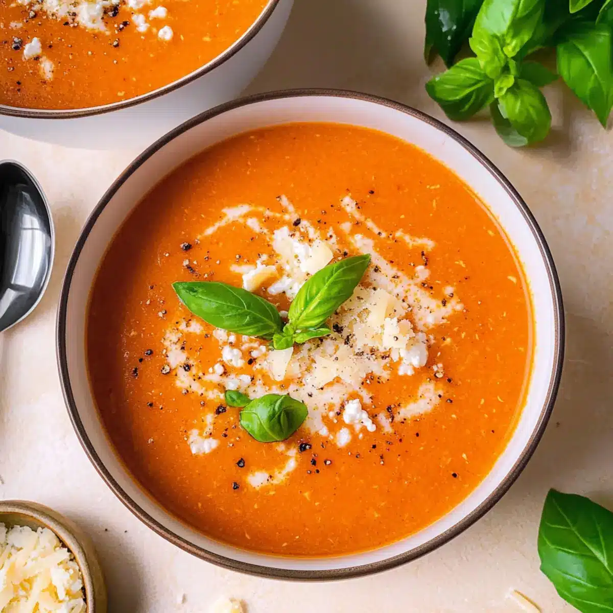 - Return blended soup to pot, adjust seasoning with salt and fresh cracked pepper if needed. Reheat gently and serve hot, garnished with Parmesan and fresh basil.
