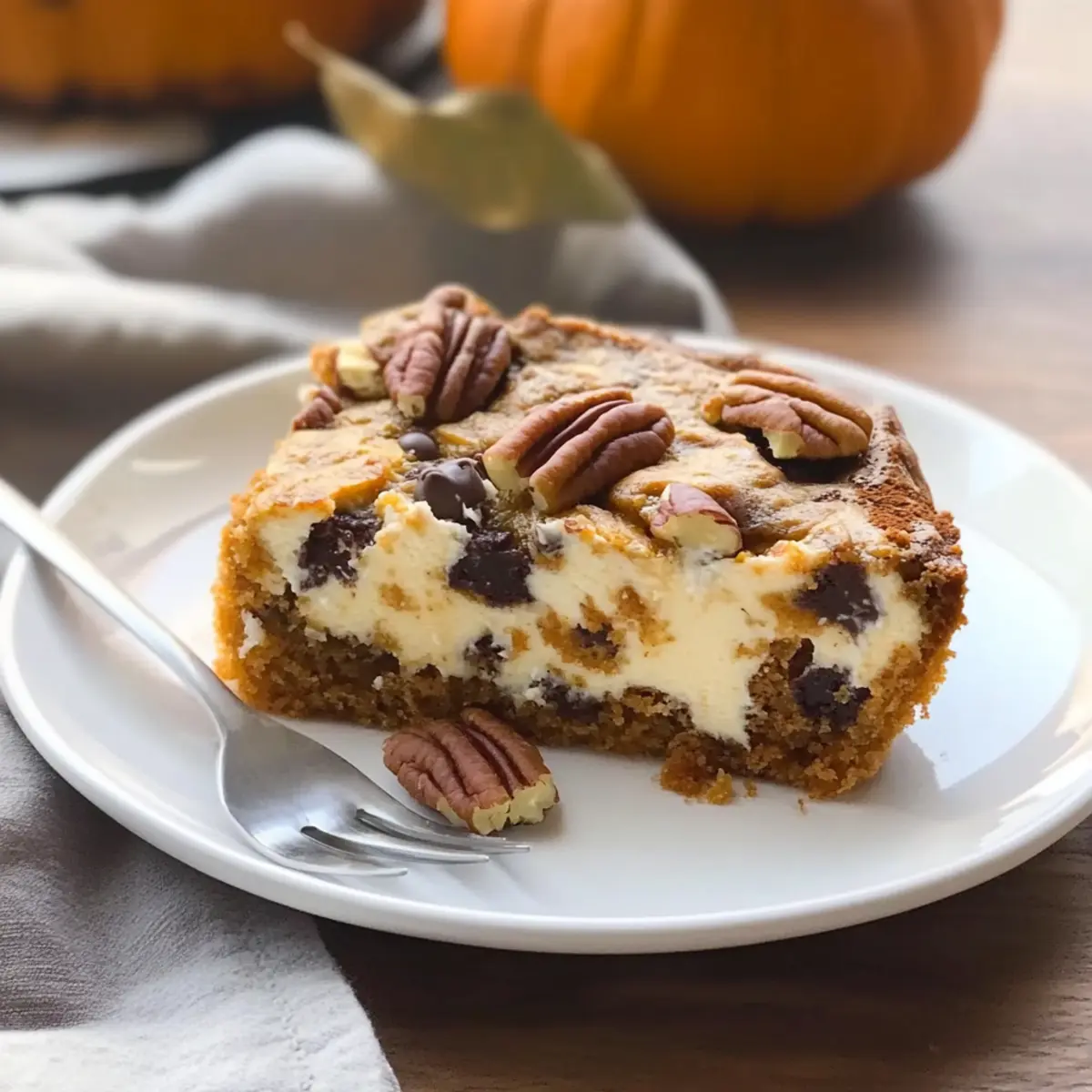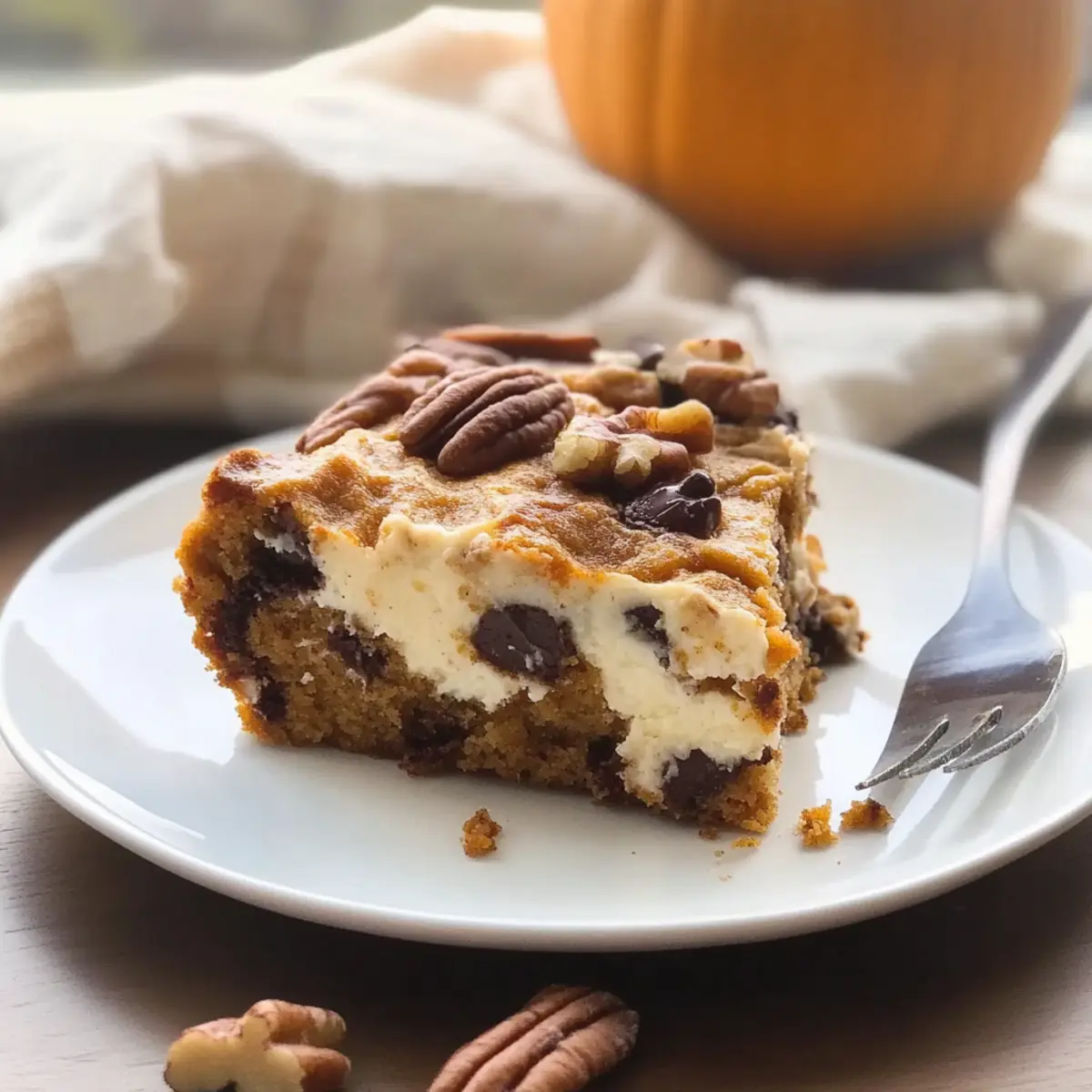 Using a spoon, dollop the cream cheese mixture evenly over the top of the cake batter. With a knife, gently swirl the cream cheese into the batter, creating a marbled effect. This will ensure that every slice is filled with gooey goodness, making each bite a delightful surprise filled with cream cheese and pumpkin spice flavors.