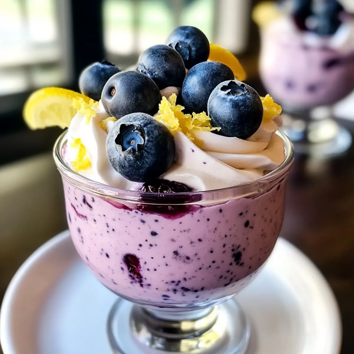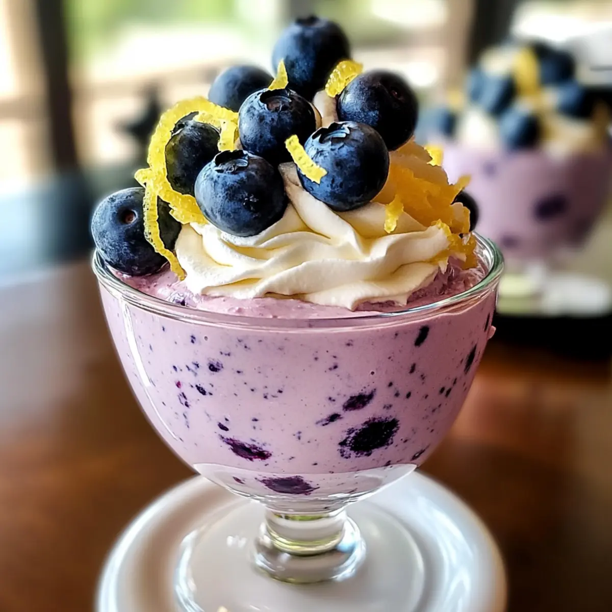 Spoon the fluffy cheesecake mixture into elegant dessert glasses, filling each one to your desired level. For a delightful finishing touch, top each serving with extra fresh blueberries. You can choose to serve immediately for a softer texture, or refrigerate for 15-30 minutes to allow the flavors to meld and the mixture to firm up slightly for a perfect, enjoyable treat.