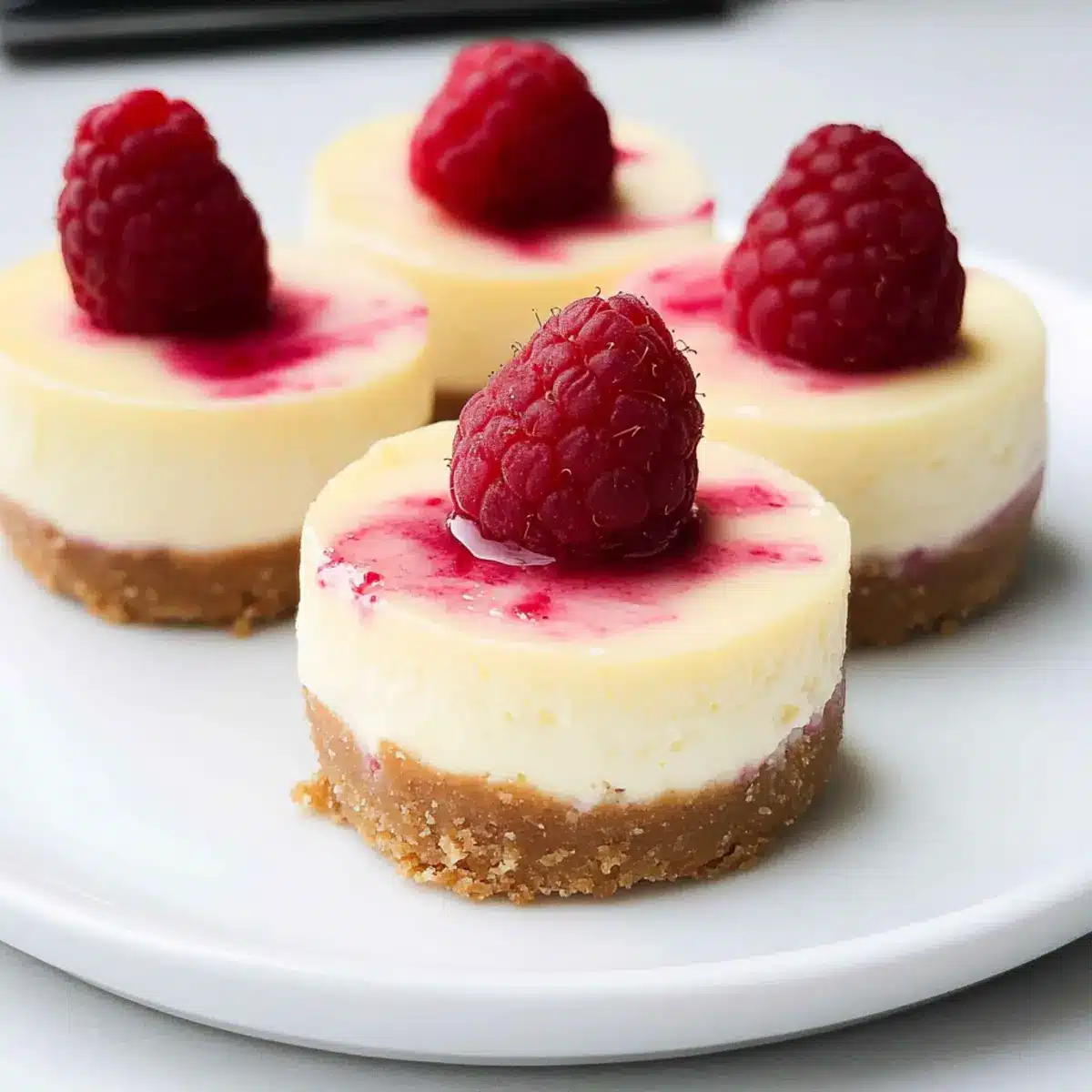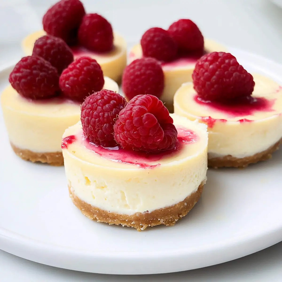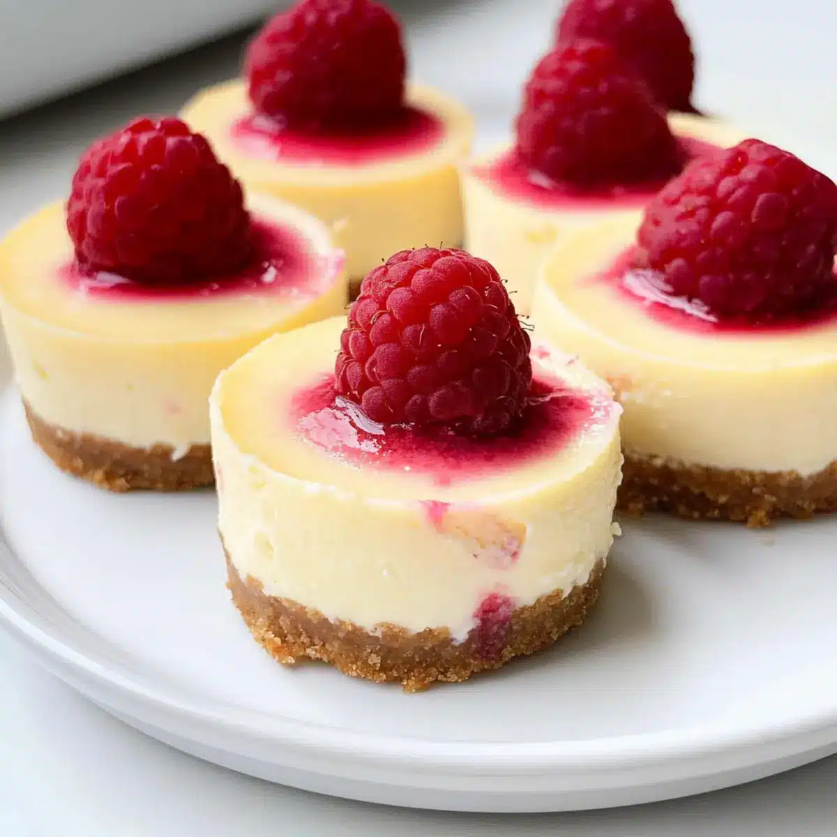 - Pour the filling over the crusts and press fresh raspberries into each cheesecake.