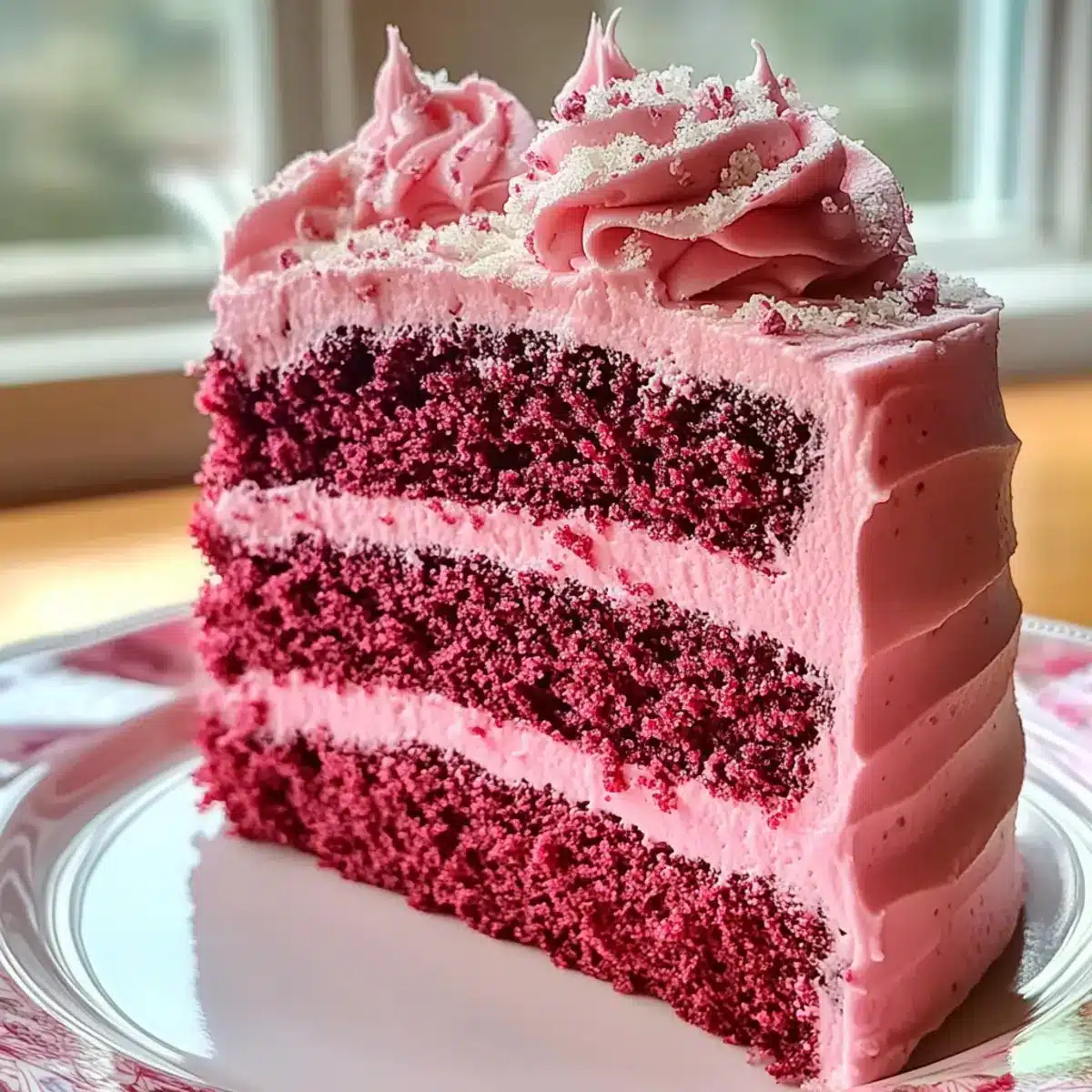 Absolutely! To freeze Pink Velvet Cake, wrap each layer tightly in plastic wrap and then in aluminum foil—this helps prevent freezer burn. Place the wrapped layers in a freezer-safe bag and store them for up to 3 months. To enjoy, thaw the layers in the refrigerator overnight before bringing them to room temperature prior to serving.