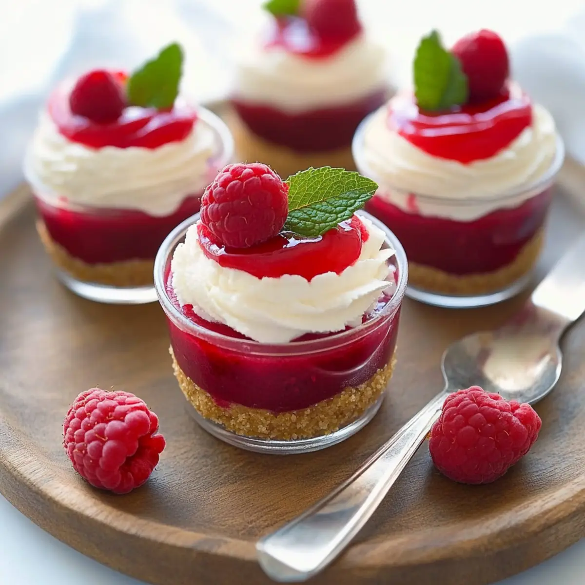- Layer cheesecake filling into the crust, add raspberry sauce, and repeat layers if desired. Top with reserved whipped cream and garnish with fresh raspberries and mint leaves before serving.
