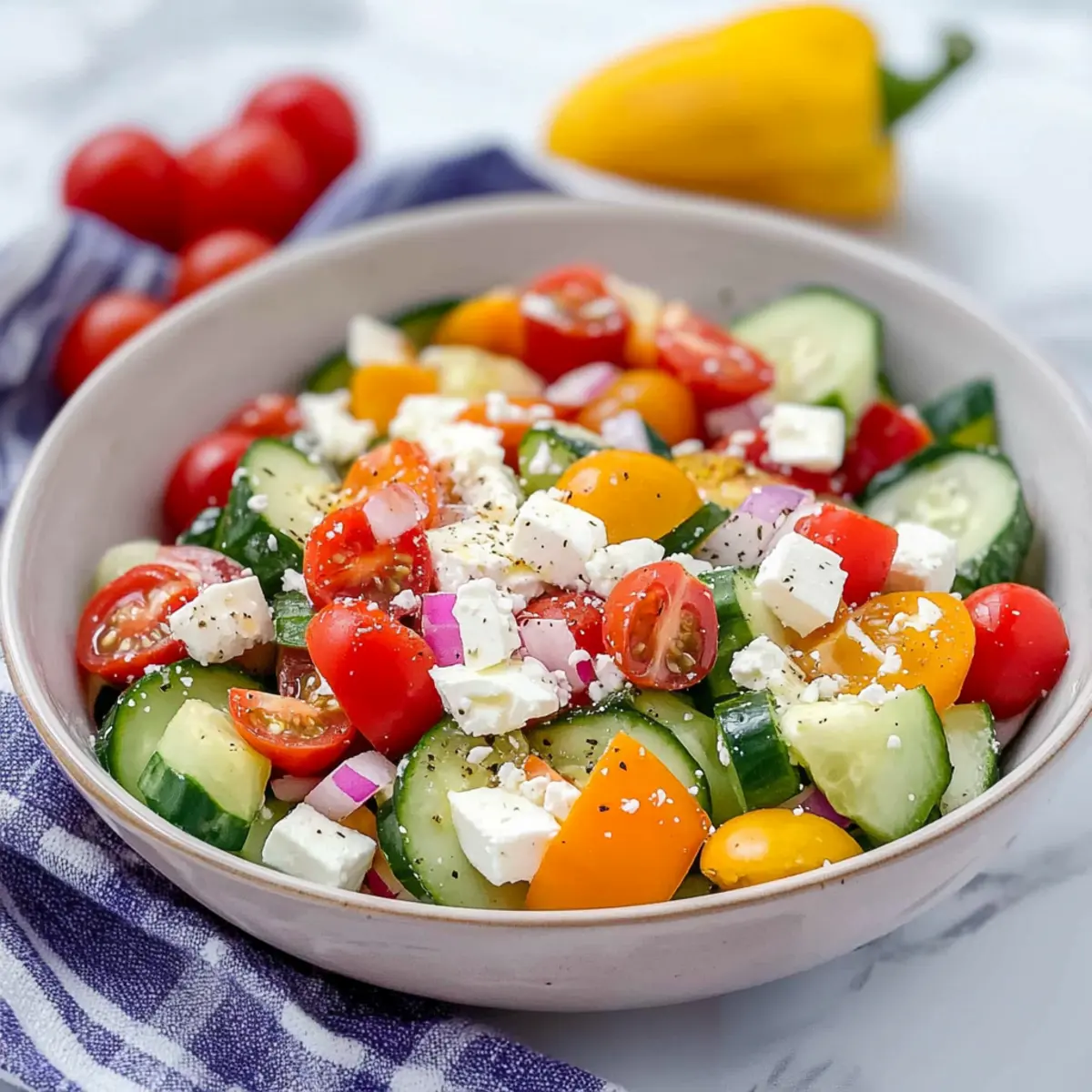 Begin by washing your vegetables thoroughly. Slice the English cucumber into half-moons and the bell pepper into thin strips. Chop the red onion into thin slices and halve the cherry tomatoes. Place all these vibrant veggies into a large mixing bowl, creating a colorful medley that will form the base of your Simple Greek Salad.
