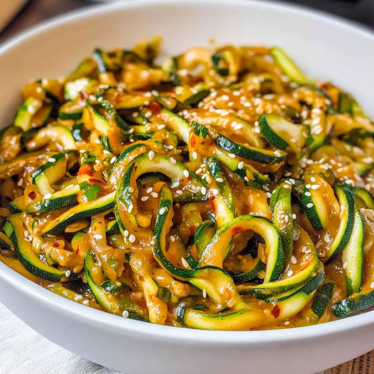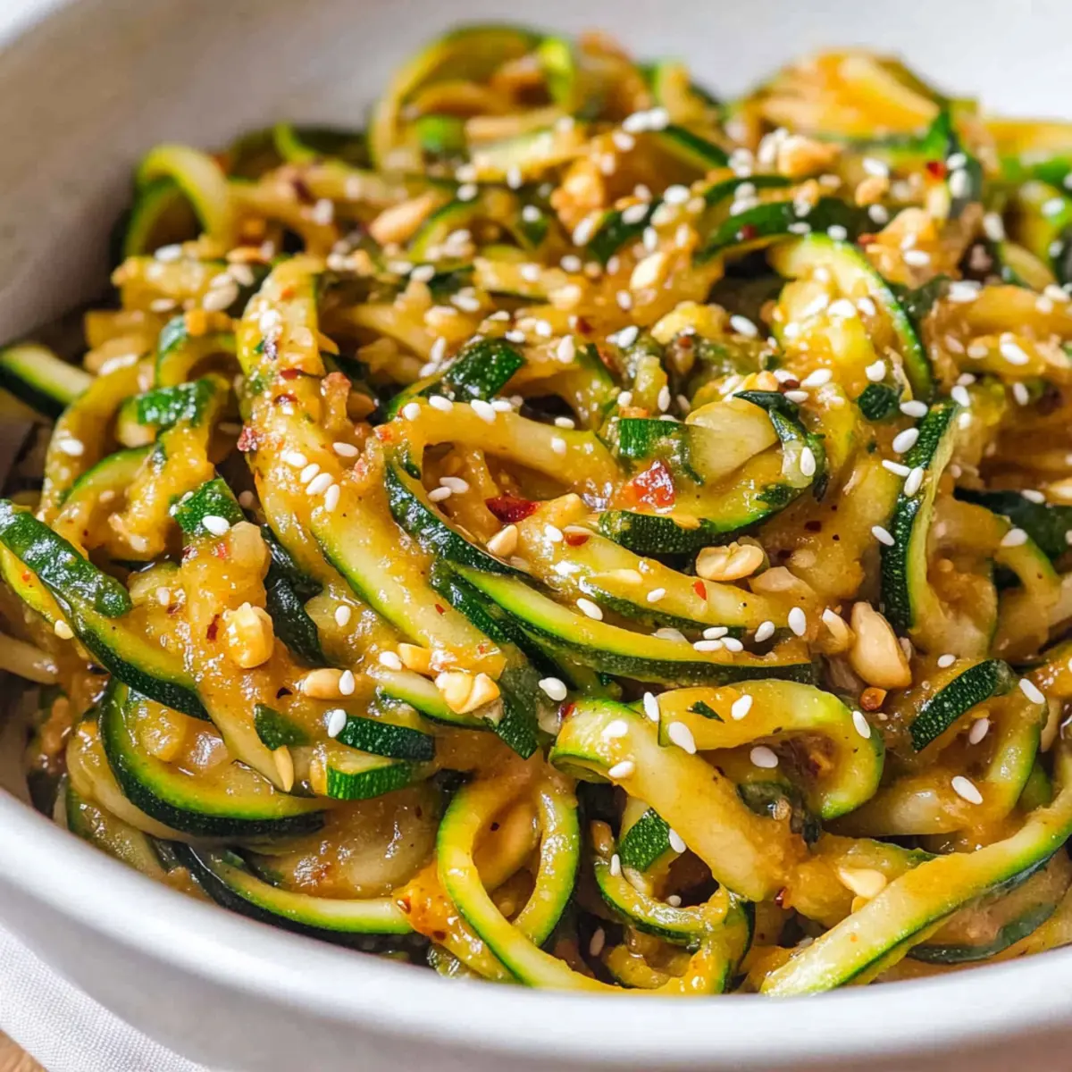 - Once combined, transfer your zoodles to a serving platter or individual bowls. Sprinkle toasted sesame seeds and thinly sliced green onions generously over the top.