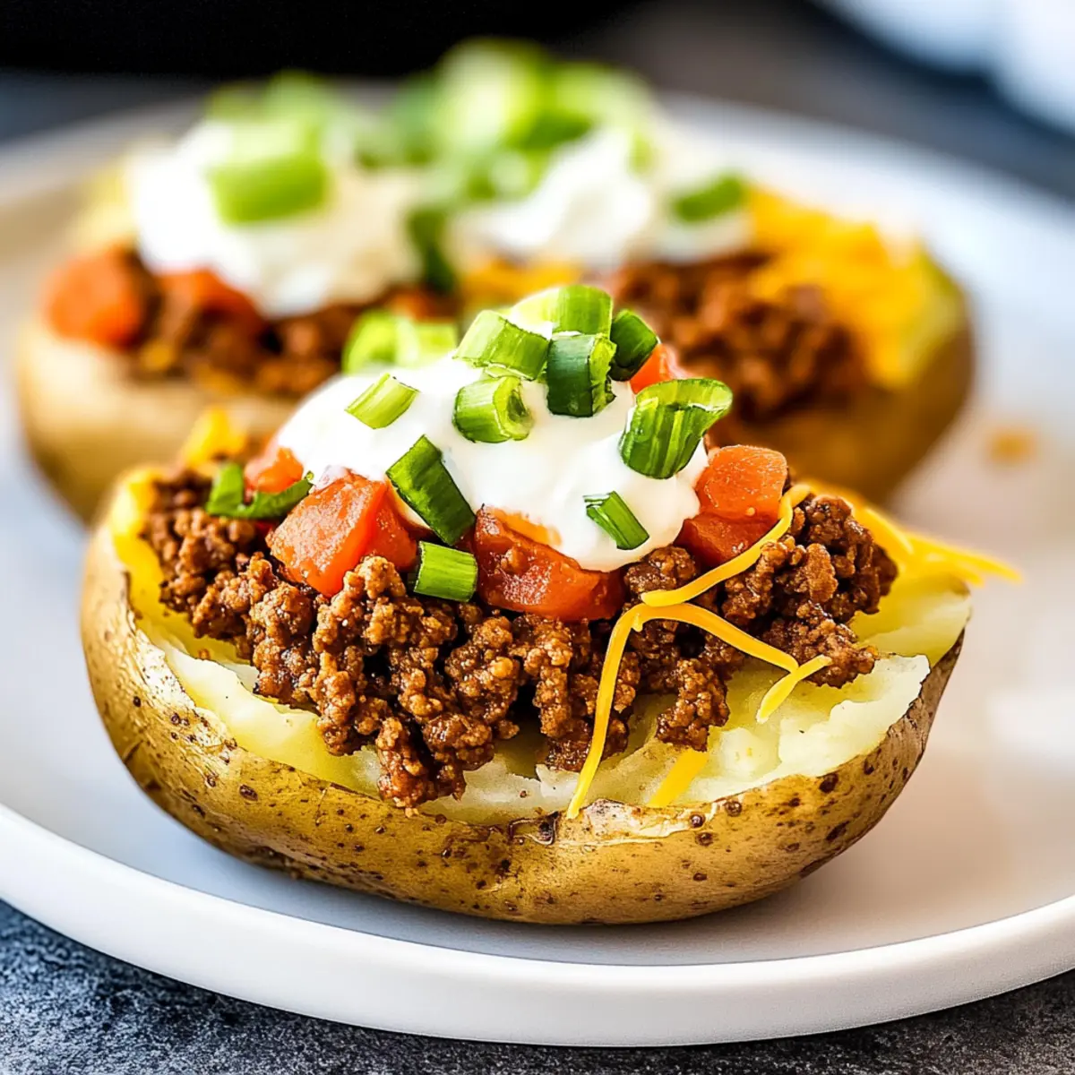 Begin filling each potato generously with the seasoned ground beef mixture you prepared earlier. Then, top them off with shredded lettuce, a sprinkle of cheddar cheese, a dollop of sour cream, and your favorite salsa, guacamole, and chopped green onions. The colorful toppings add a delightful crunch and flavor.