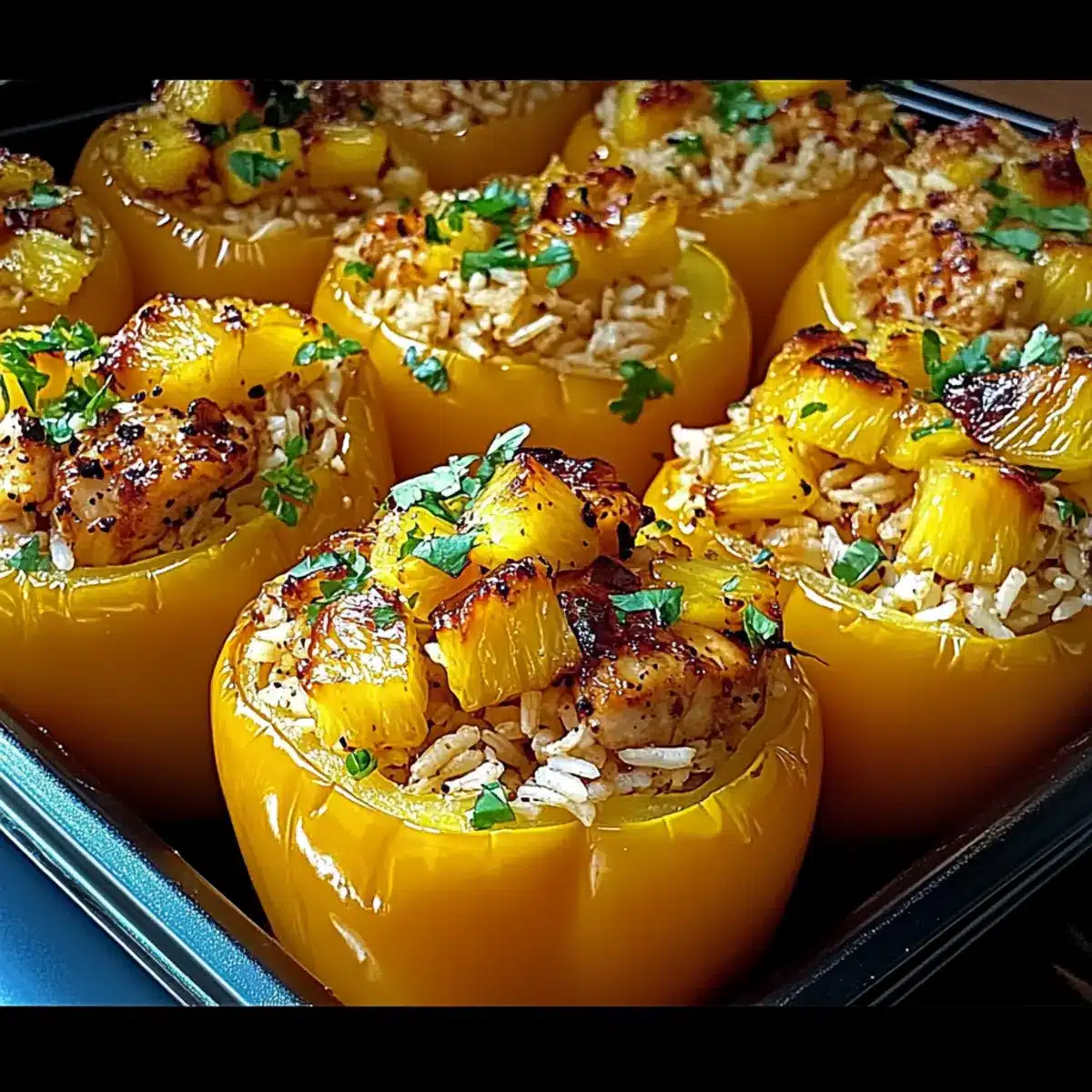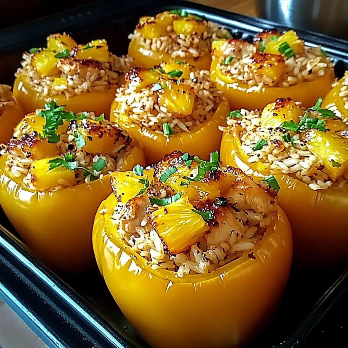 Cover your baking dish tightly with aluminum foil and place it in the preheated oven. Bake for 25–30 minutes, ensuring the peppers become tender yet remain firm. If you prefer a crispy top on your Teriyaki Pineapple Chicken and Rice stuffed peppers, remove the foil during the last 5 minutes of baking or sprinkle some shredded cheese on top before returning them to the oven.