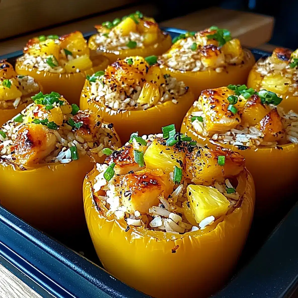 Once the peppers are done baking, carefully remove them from the oven and let them cool slightly for about 5 minutes. This cooling time allows the flavors to settle. If desired, garnish with extra pineapple or finely chopped green onions for a fresh finish, adding visual appeal along with flavor before serving.
