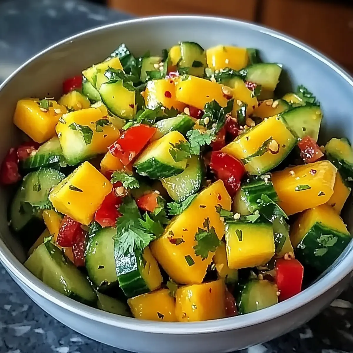 Dress Just Before Serving: To maintain the crispness of cucumbers and the integrity of the mango, dress the salad right before serving, preventing sogginess.