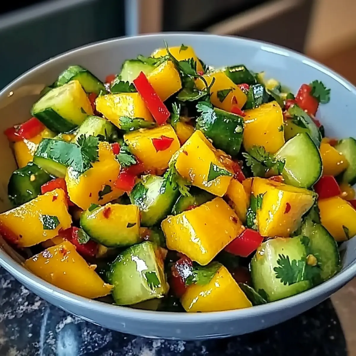 Vibrant Colors: This salad is a feast for the eyes, featuring the stunning hues of mangoes and cucumbers.