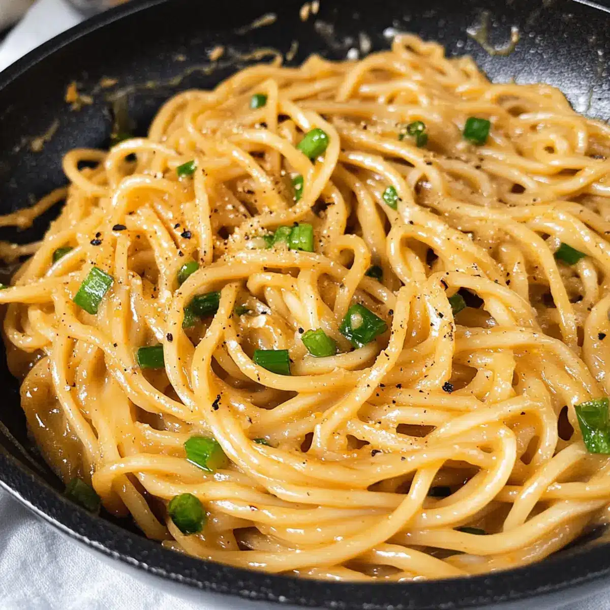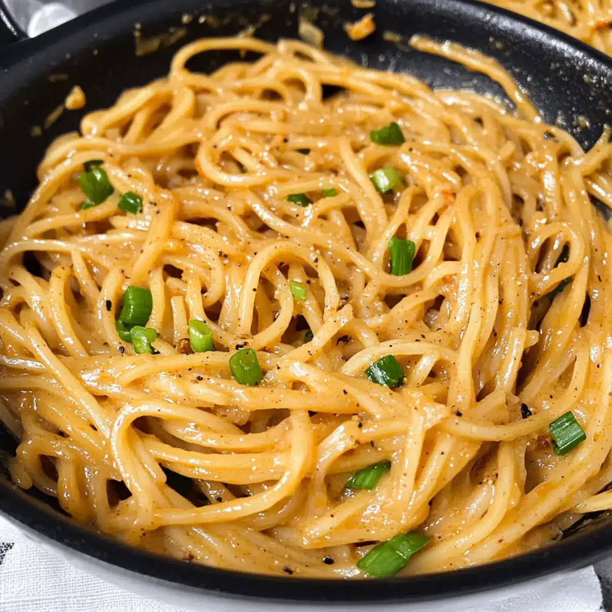 Add the cooked pasta to the skillet, using tongs to toss everything together. Ensure that each strand of noodle is coated with the garlicky sauce and mingled with the green onions. Keep tossing for about 1-2 minutes until the pasta is heated through, absorbing all the delightful flavors from the sauce.