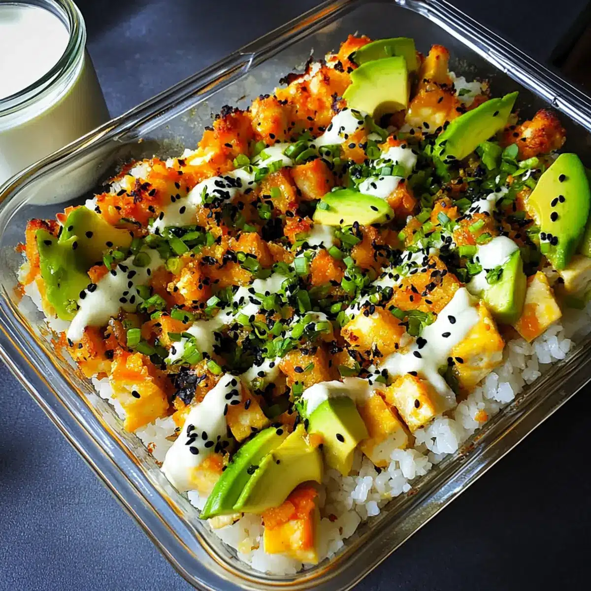 - Once baked, carefully remove the dish from the oven and let it cool slightly. Top with slices of avocado and cucumber. Drizzle with sriracha and vegan mayonnaise, and sprinkle with sesame seeds.