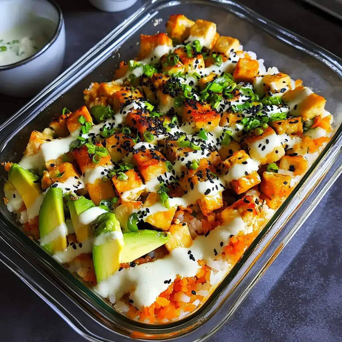 - Preheat your oven to 375°F (190°C). In a greased baking dish, evenly spread the seasoned sushi rice as the bottom layer. Arrange the marinated tofu mixture on top of the rice.
