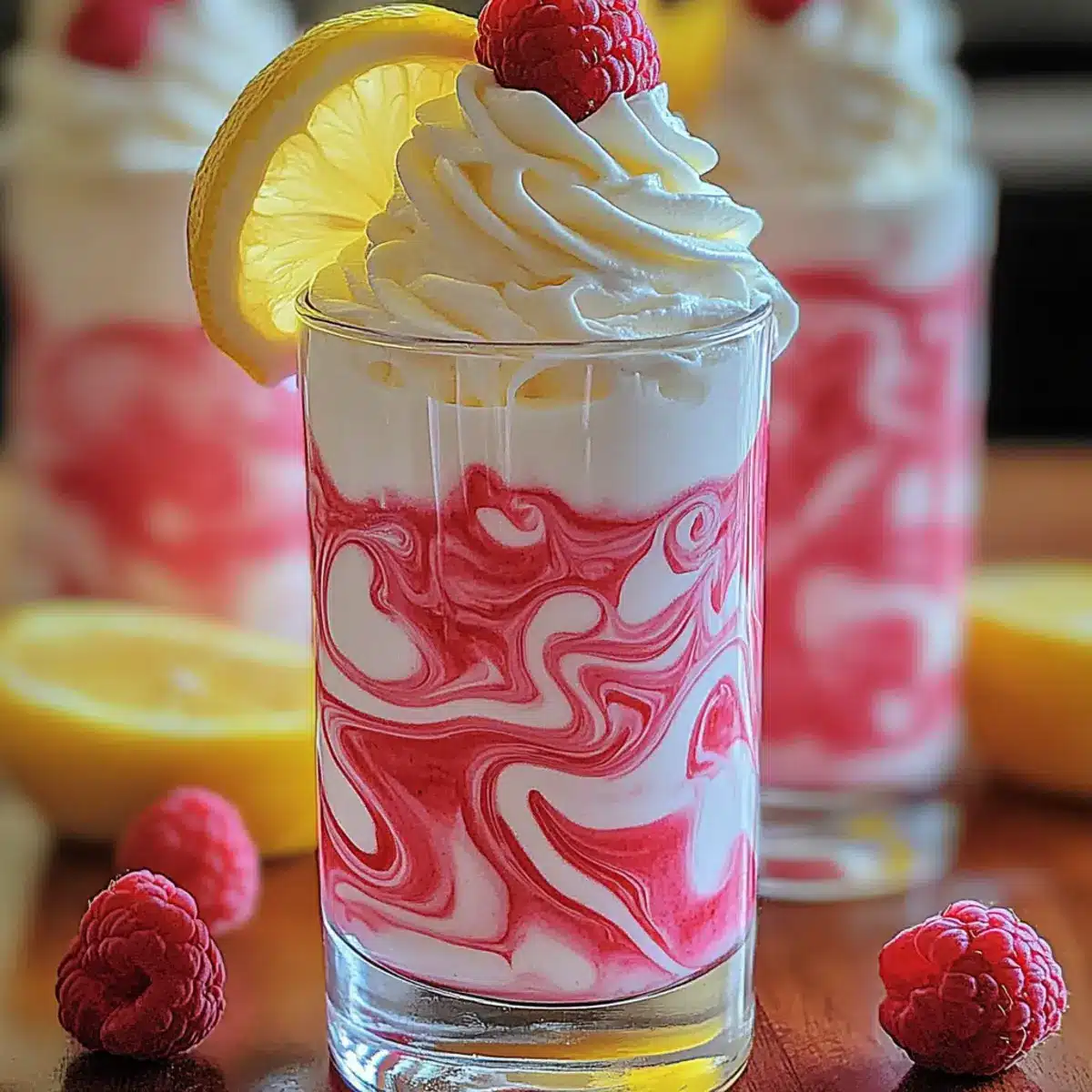 - Pour the lemonade mixture over the raspberry swirl in each glass.